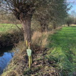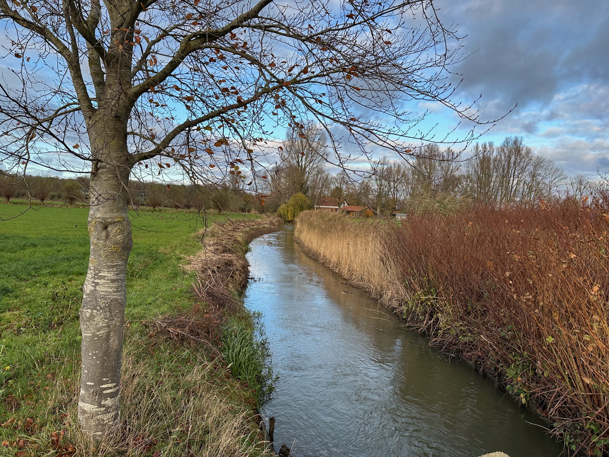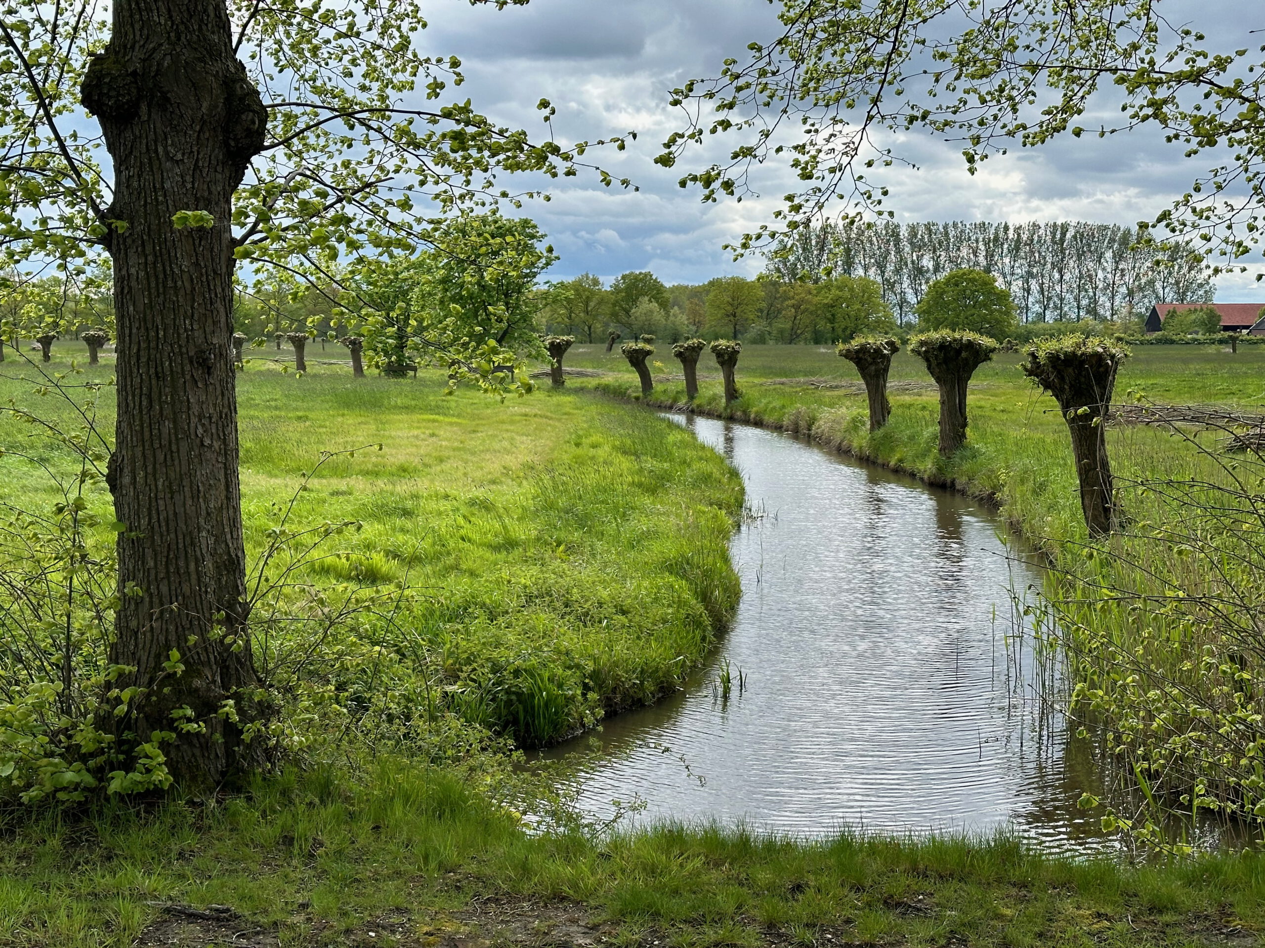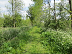 Het pad naar de Kromme Rijn heeft weer een ander karakter, want zeer groot zijn de grasakkers, hier is geen bloemetje te zien, alles in dienst van de veehouderij – ‘grasfalt’ levert veel veevoedsel op, maar doet afbreuk aan de diversiteit van de natuur. De Kromme Rijn doorkruist de grasakkers, hier kaarsrecht en dat komt omdat het een gegraven kanaaltje is, want al in 1473 werd op deze plek een grote rivierbocht afgesneden. Iets verder ligt het restant van die oude meander, de Achterrijn 6, ooit dus de hoofdgeul, nu nog altijd van groot belang voor de afwatering. In de verte blinkt Beverweerd, maar de wandelroute richt het vizier op de spits van Werkhoven, terug op de wat hoger gelegen oeverwal van de Kromme Rijn.