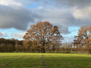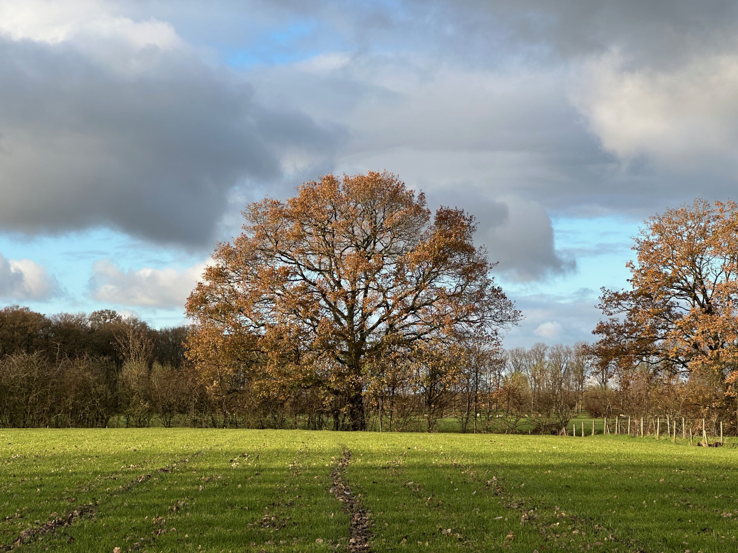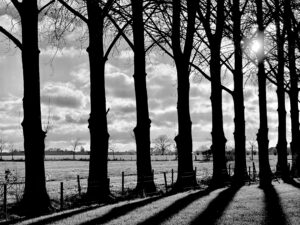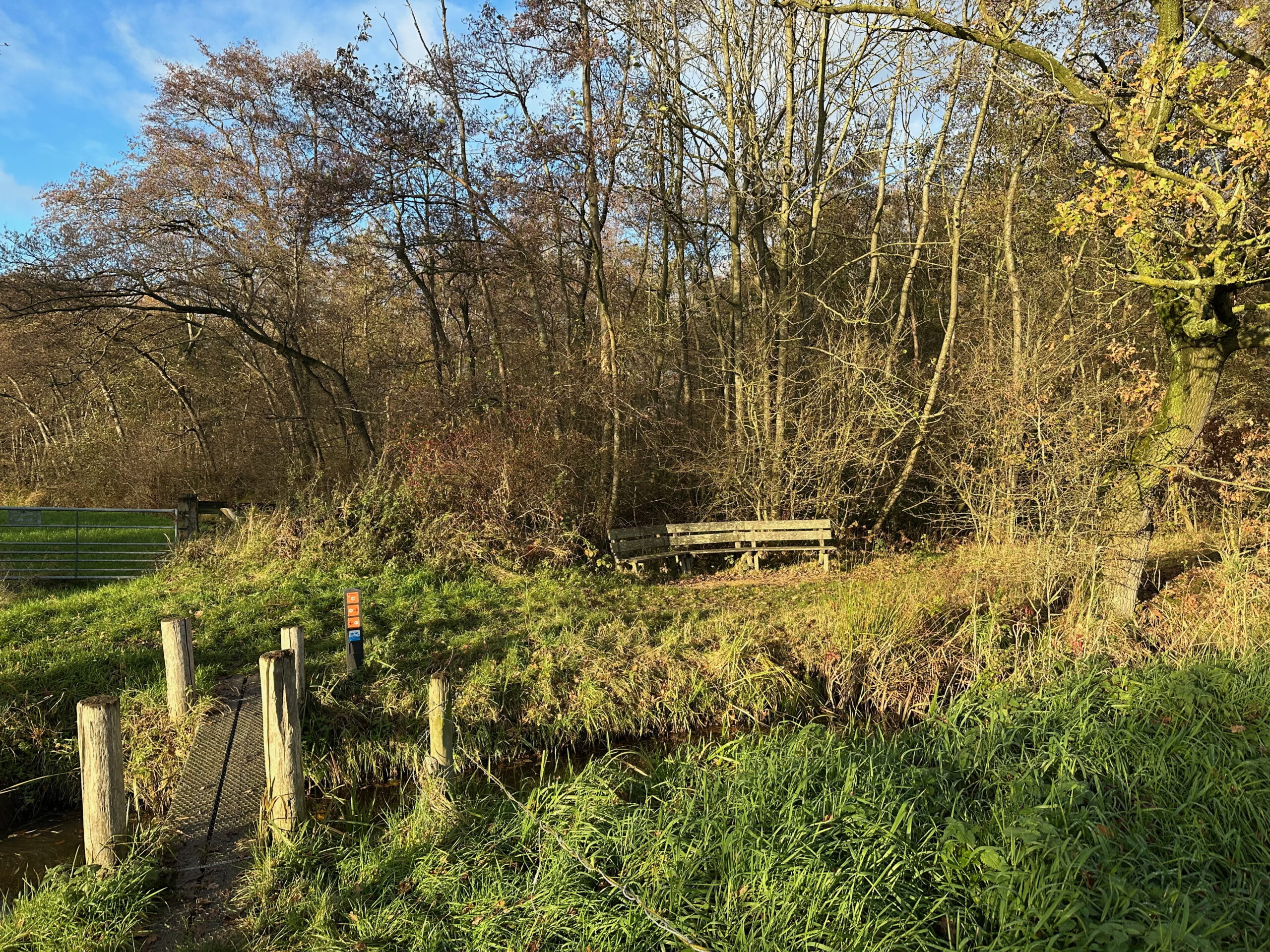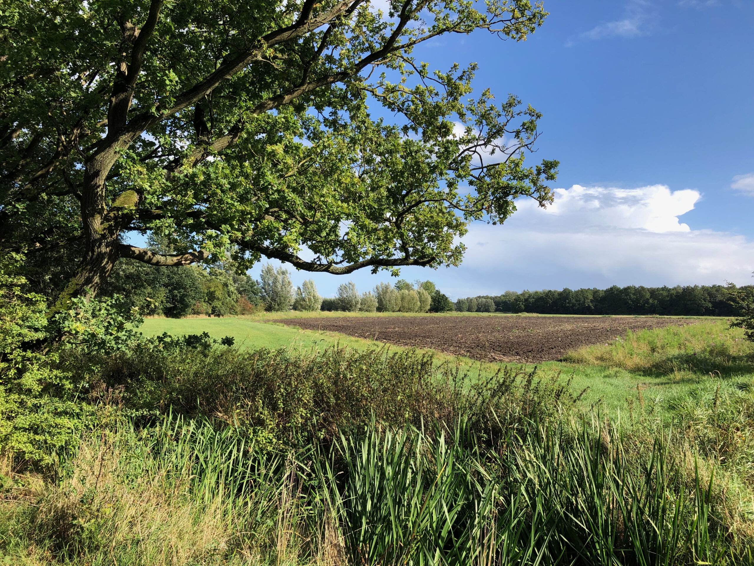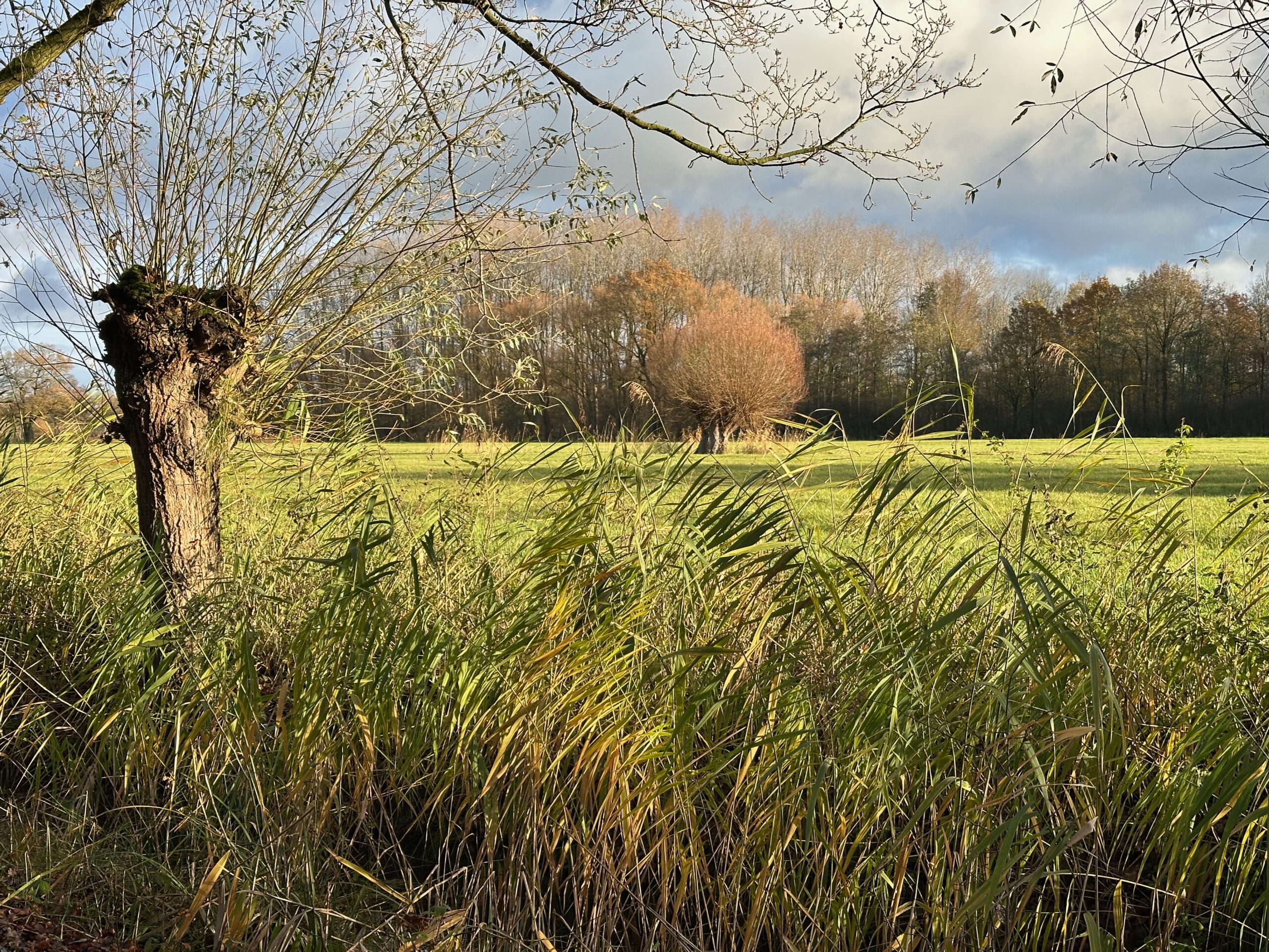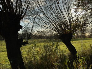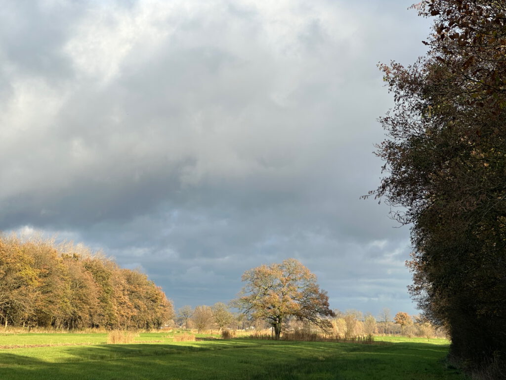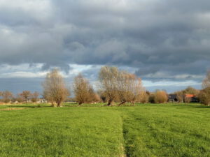Nauwelijks is er een pad te zien, dus volg je maar de bosrand. Zicht is er op een solitaire eik en de windgedreven wolken erboven. Aan een slootje zit een reiger, ineengedoken, kikkerzoekend. Deze wandeling met wildernis kent als tegenpool pronkjuweel Beverweerd aan de ingetogen Kromme Rijn. Zompige paden en keurige lanen liggen beide in het strakke, eeuwenoude raamwerk van het cultuurlandschap rondom de Langbroekerwetering.