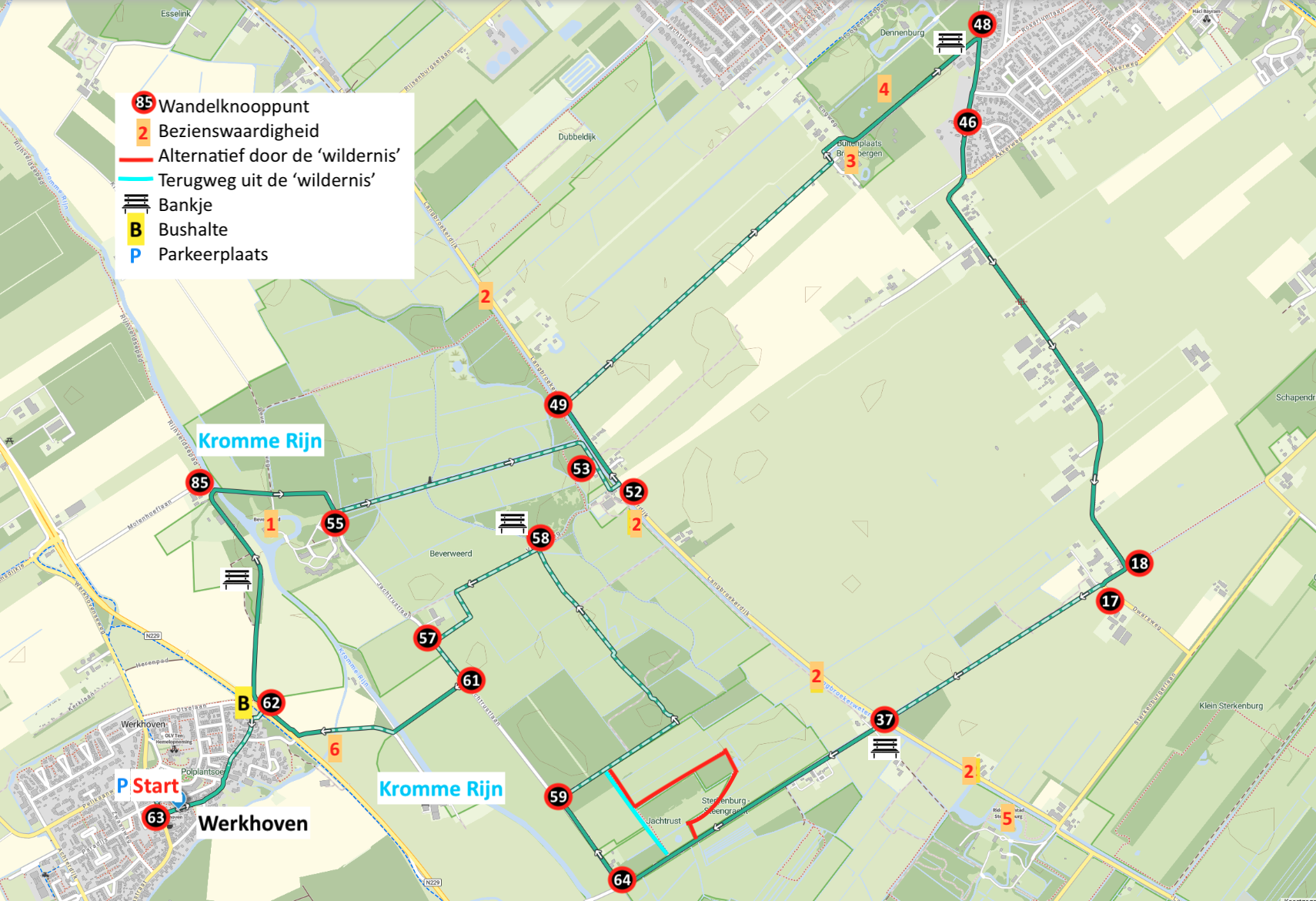 START EN FINISH Met de auto: parkeerplaats Rode Haan, schuin tegenover de kerk van Werkhoven; met ov: bushalte Werkhoven, Beverweertseweg. Lijn 41 vanaf Utrecht CS naar Wijk bij Duurstede